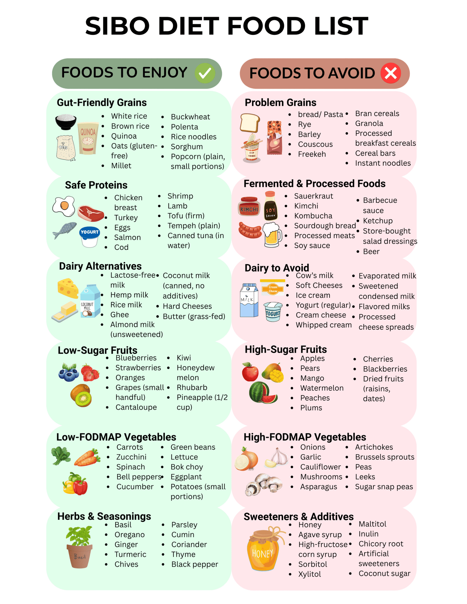 This doctor-inspired, color-coded printable cheat sheet organizes all key low-FODMAP foods and high-FODMAP triggers to effectively manage SIBO and IBS symptoms.